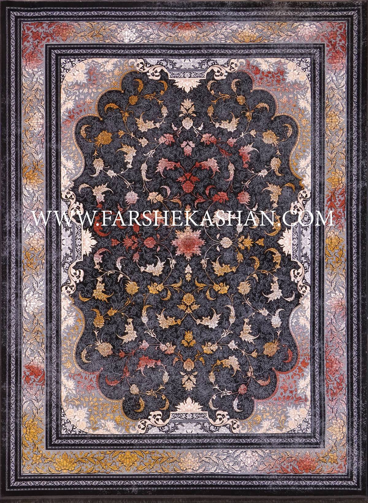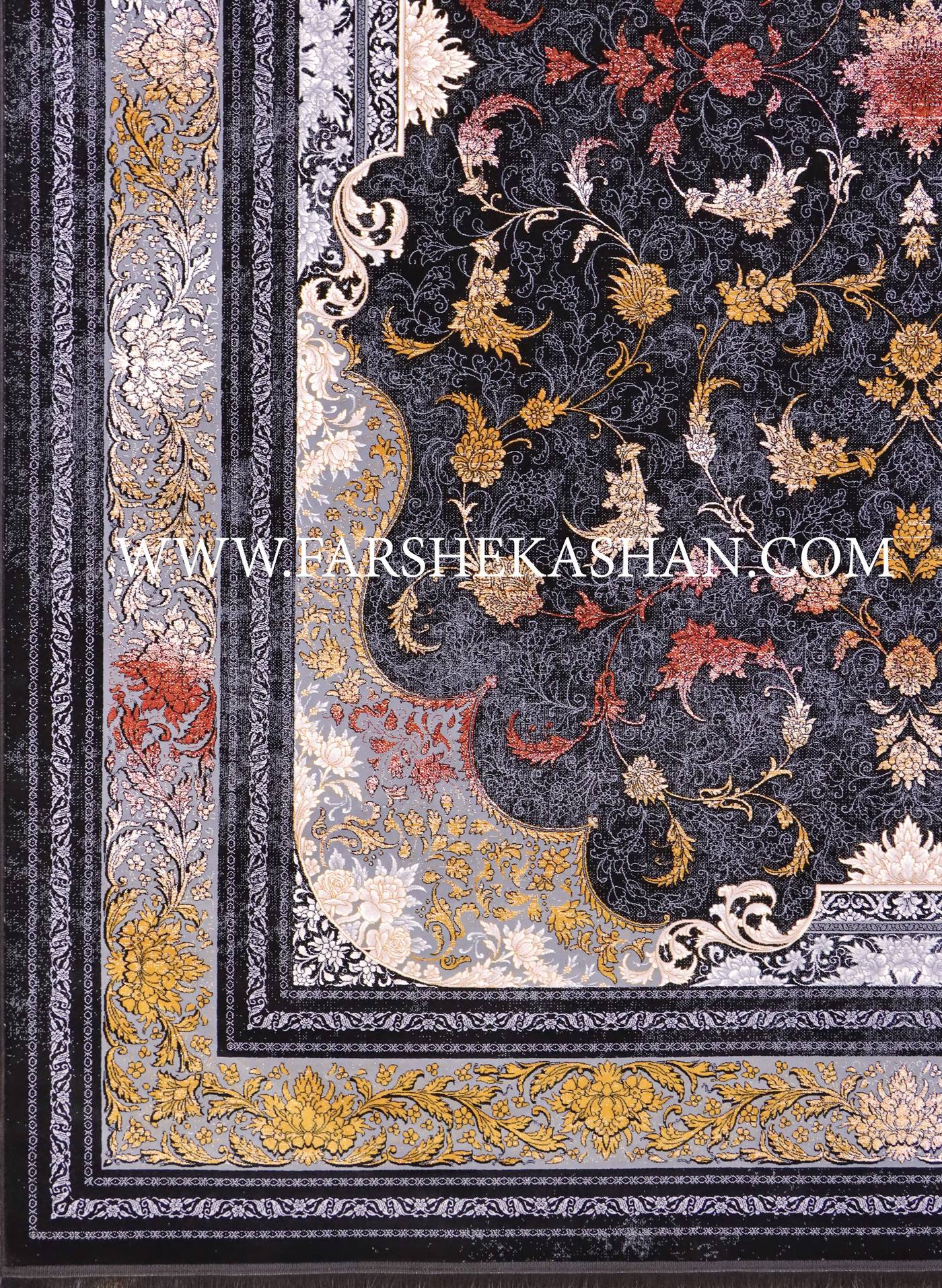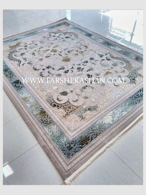 رنگبندی این فرش ترکیبی از نقرهای، دودی، سبز و طلایی است که جلوهای مدرن اما اصیل به آن داده است. استفاده از طیفهای رنگی مات و براق در کنار هم باعث شده است که در زوایای مختلف، تغییر رنگهای جذابی ایجاد شود. رنگ زمینهی نقرهای یا دودی، به فضا حس روشنایی و وسعت میدهد، درحالیکه جزئیات طلایی و سبز، جلوهای لوکس و خاص اضافه میکنند. این نوع ترکیب رنگی، علاوه بر ایجاد زیبایی بصری، باعث میشود که فرش با انواع مبلمان و دکوراسیونهای کلاسیک و مدرن هماهنگ باشد.