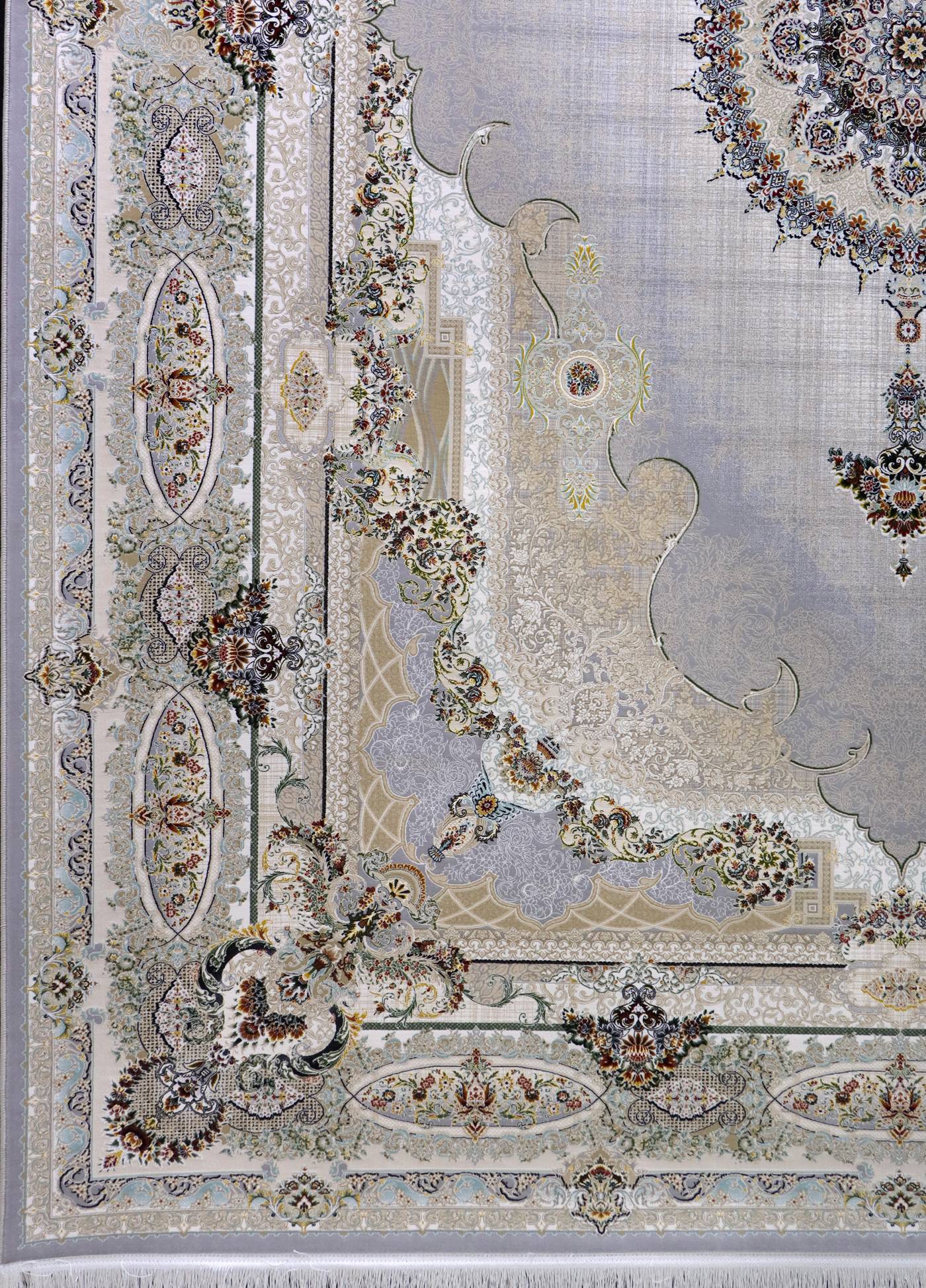 حاشیهها، قاببندی و کنارهها حاشیهٔ این فرش از چند لایهٔ محافظ (guard borders) تشکیل شده که هریک نقش و کارکردی جداگانه دارند: لایههای باریکِ داخلی با خطوطِ پیوسته و نقاطِ گل ریز، سپس حاشیهٔ اصلی با قابهای بیضی شکل که داخل شان یک ترکیب گل پیچ و ریزههای تزئینی تکرارشونده یافته است. این قابهای بیضی در کنارهها به صورت موزون تکرار شدهاند و با فواصل هم سان، ریتمی آرام و منظم ایجاد میکنند؛ در گوشهها گل مدالیونهایی کار شده که هم راستا با ترنج مرکزی عمل قاببندی را تکمیل میکنند. تماس بین حاشیه و میدان میانی نرم است و از طریق آرکها و موتیفهای مشبک به هم پیوند میخورند؛ این پیوند جلوهای پلکانی از جزئیات ایجاد میکند که از مرکز به کنارهها جاری میشود. ترکیب حاشیه و میدان، چشم را از مرکز به کنارهها هدایت میکند و جلوهای قابمانند به فضا میبخشد. در نسخهٔ نقرهای، کنارهها بهسبب جلوهٔ انعکاسی، نورپردازی محیط را تقویت میکنند. و متناسب است.