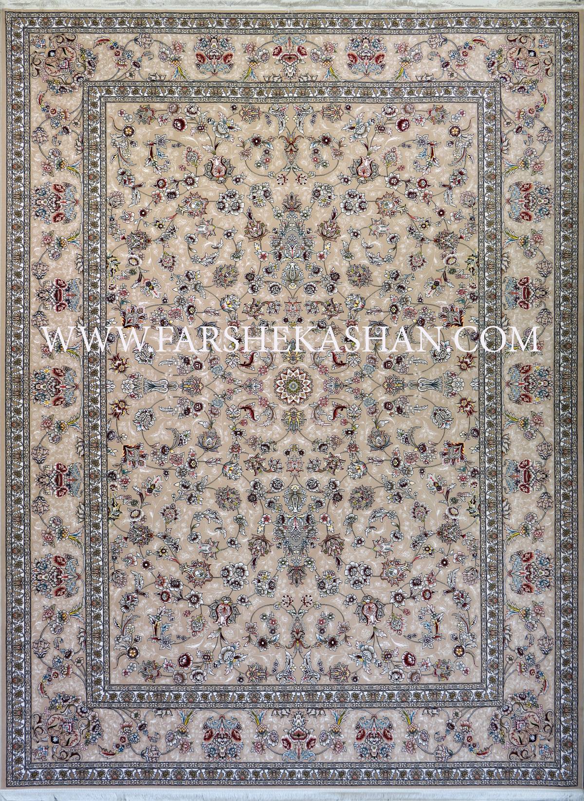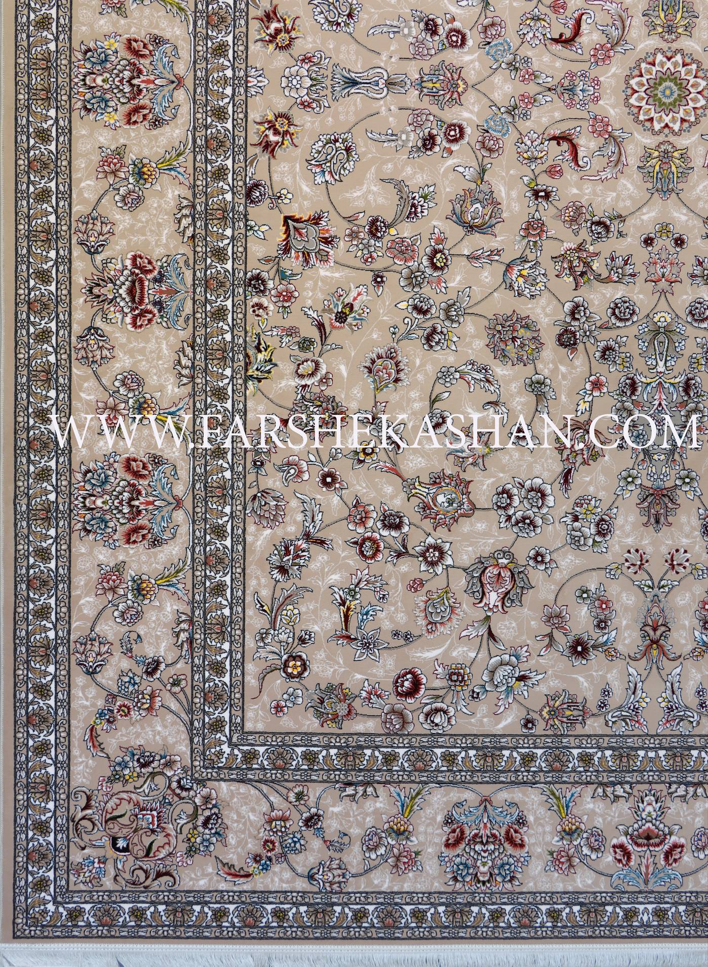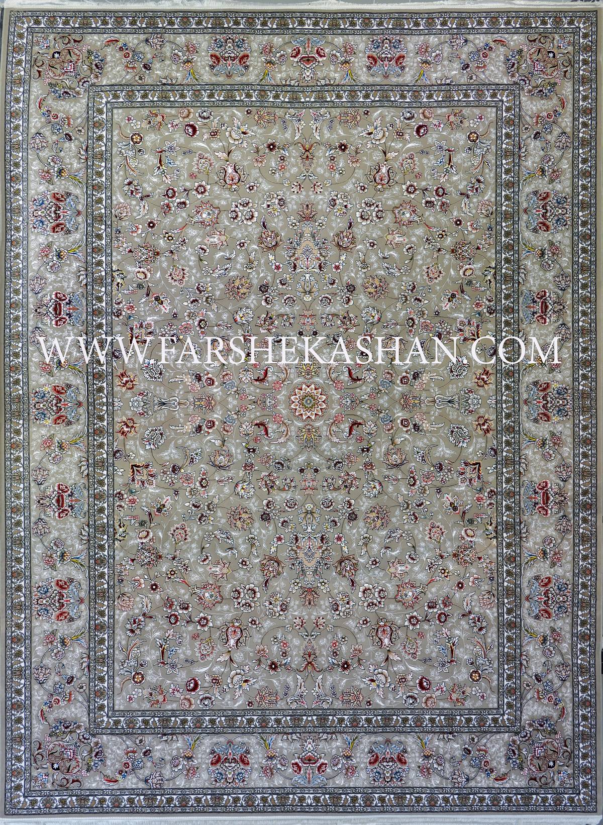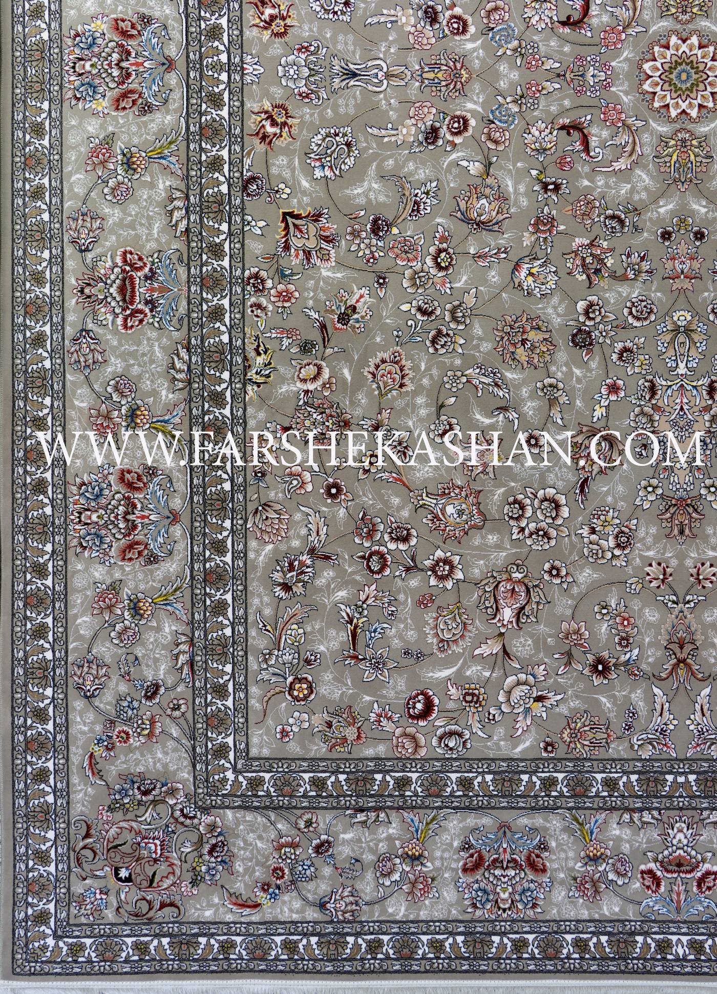 ۲. رنگ فیلی لطافت و وقار در یک قاب رنگ زمینه فیلی در این فرش، نقش یک بستر آرام و شیک را ایفا میکند. طیف خاکستری-نقرهای ملایم با درخشش ظریف خود باعث میشود رنگ های گلها، بهویژه صورتی، لاکی، آبی فیروزهای و کرم، جلوه بیشتری پیدا کنند. این ترکیب رنگی نه تنها حس آرامش و ظرافت را منتقل میکند، بلکه با اکثر رنگهای مبلمان، از تیره تا روشن، هماهنگ میشود. رنگ فیلی، به دلیل خنثی بودن نسبی، انتخابی هوشمندانه برای فضاهایی است که نورگیر متوسط یا زیاد دارند، زیرا بازتاب نور روی زمینه، باعث جلوه بیشتر نقوش میشود. در این نسخه، گلها به شکلی برجستهتر از بژ دیده میشوند و حالت سه بعدی تری پیدا میکنند که جلوهای معاصر و لوکس به این طرح سنتی میدهد.