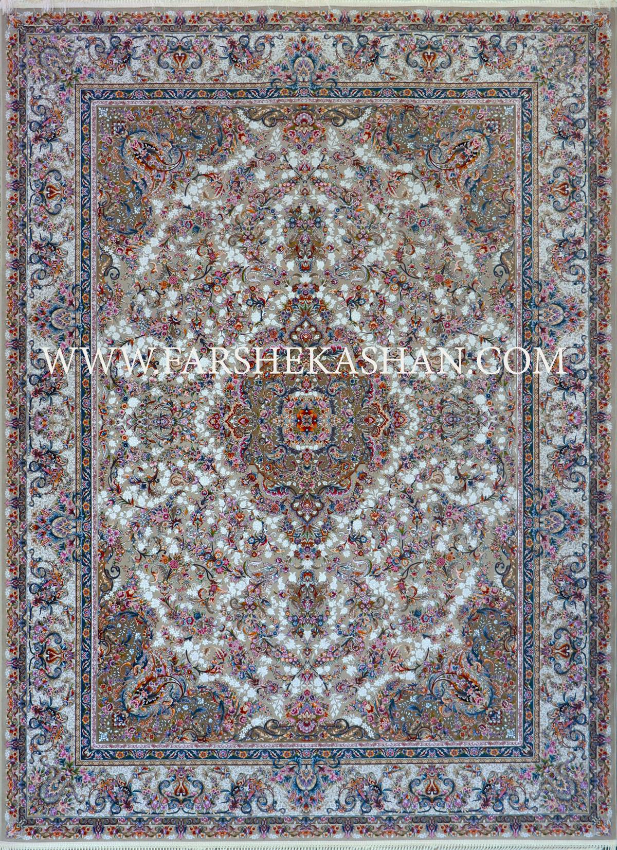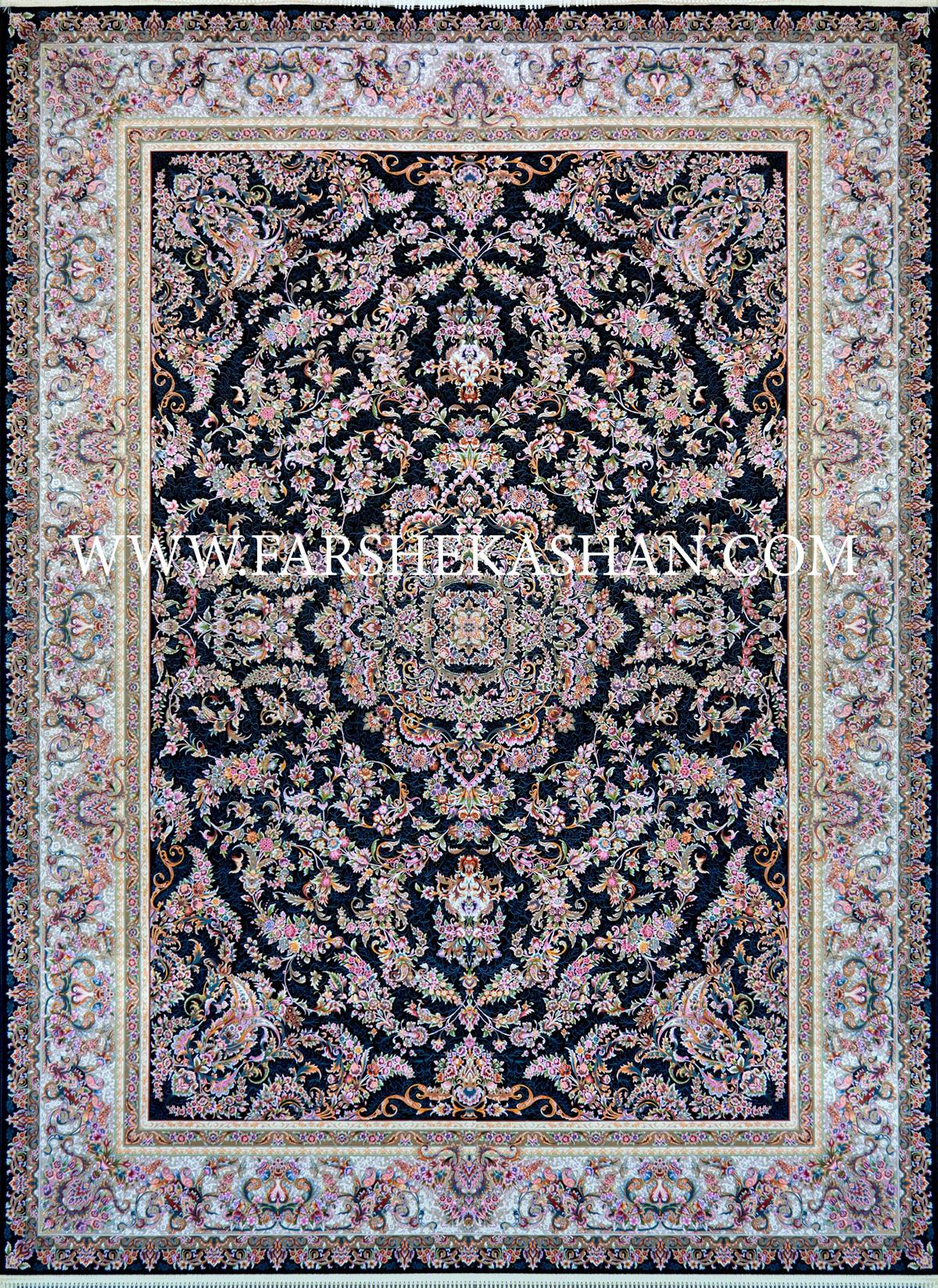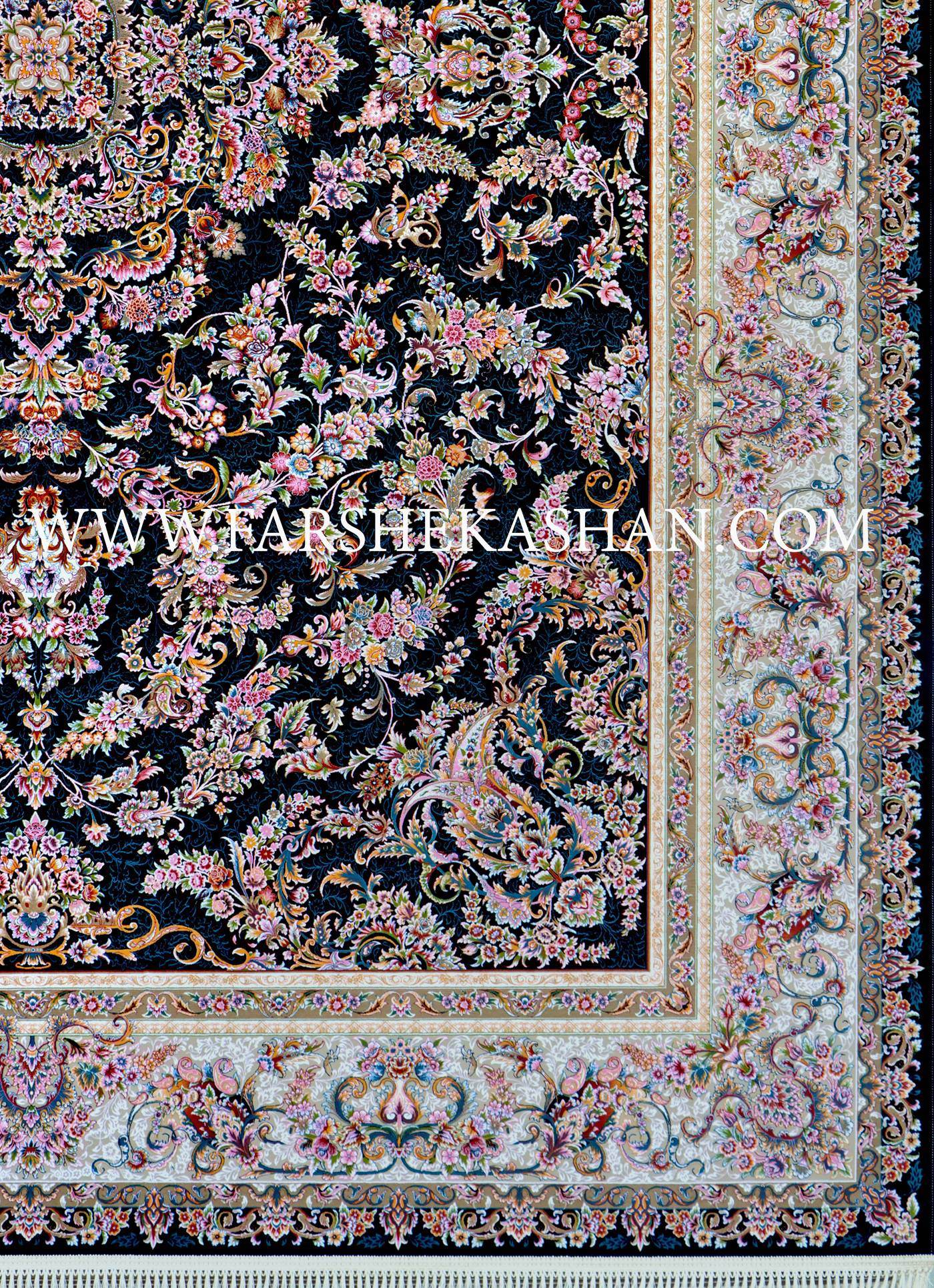 نسخه سرمه ای این فرش، بیشترین تأثیر بصری را دارد. زمینه تیره همانند شب نمادین، بستری مناسب برای گلهای رنگارنگ فراهم میکند. رنگهای صورتی، یاسی، گلبهی، سبز و آبی نفتی روی سرمهای به شکل درخشان دیده میشوند. ترنج مرکزی در این رنگ بندی بیشتر جلوه کرده و زرنگار طلایی مانند هالهای در اطراف شاخهها خودنمایی میکند. حاشیه روشن نیز تضادی دلنشین با میدان ایجاد میکند و باعث میشود فرش در هر دکوراسیون به عنوان نقطه کانونی بدرخشد. این رنگبندی بیشتر برای فضاهای رسمی، سالنهای پذیرایی بزرگ و دکوراسیونهای سنگین و مجلل پیشنهاد میشود.
