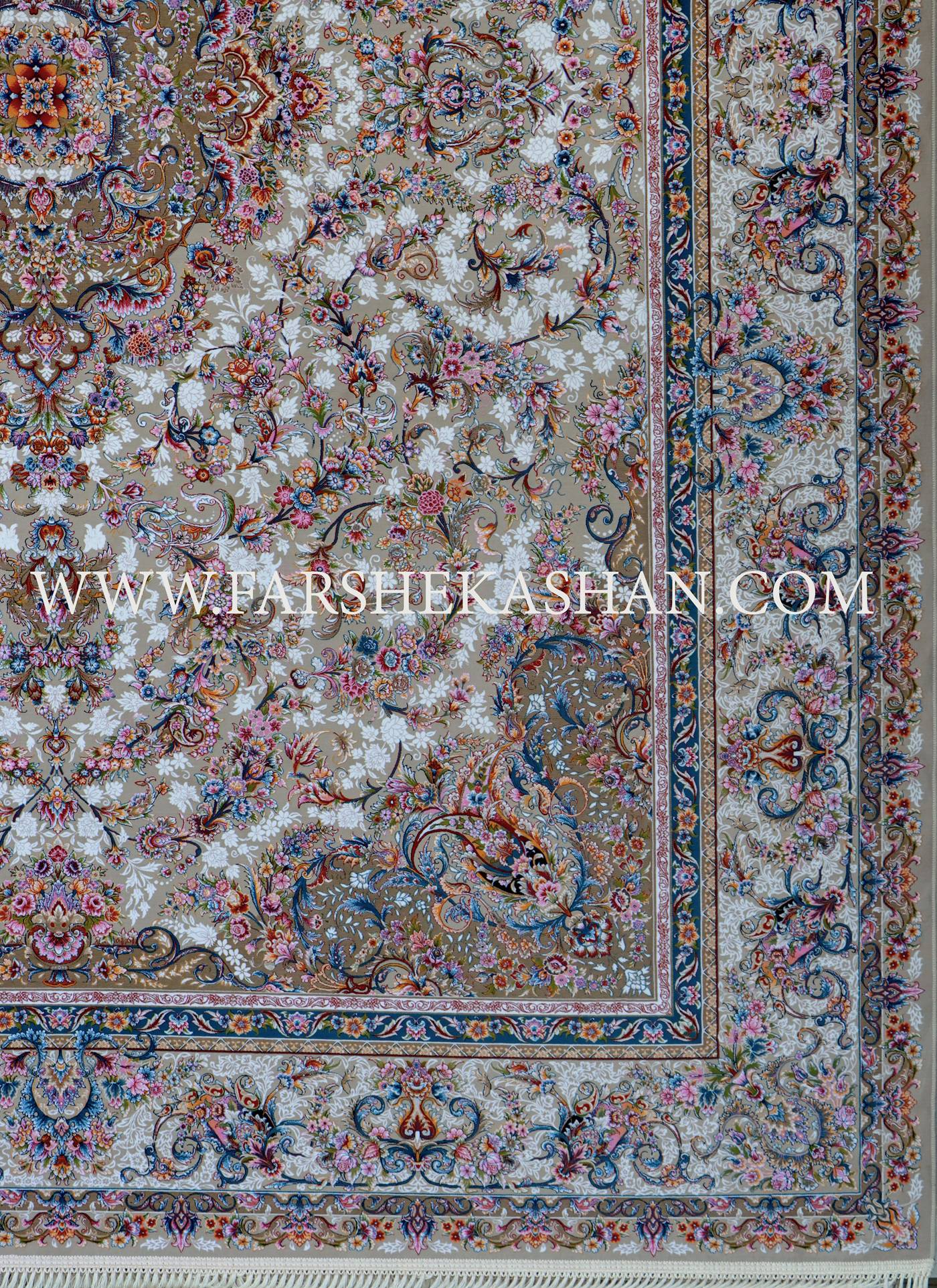 نسخه فیلی همین طرح، حالتی ملایم تر و آرام تر دارد. رنگ خاکستری روشن باعث میشود نقوش گلوبوته حالتی مه آلود و لطیف پیدا کنند. در این نسخه، تضاد رنگی کمتر است و بهجای جلوهی نمایشی، نوعی هارمونی و هماهنگی بر کل طرح حاکم است. ترنج و لچکها همچنان مرکزیت خود را دارند، اما با لطافت بیشتری در چشم مینشینند. این رنگبندی برای فضاهای روشن، خانههای مدرن یا دکوراسیونهای مینیمال کلاسیک بسیار مناسب است؛ چون بدون شلوغی، جلوهای اصیل و پرجزییات به محیط میدهد و در عین حال حس آرامشبخشی دارد.