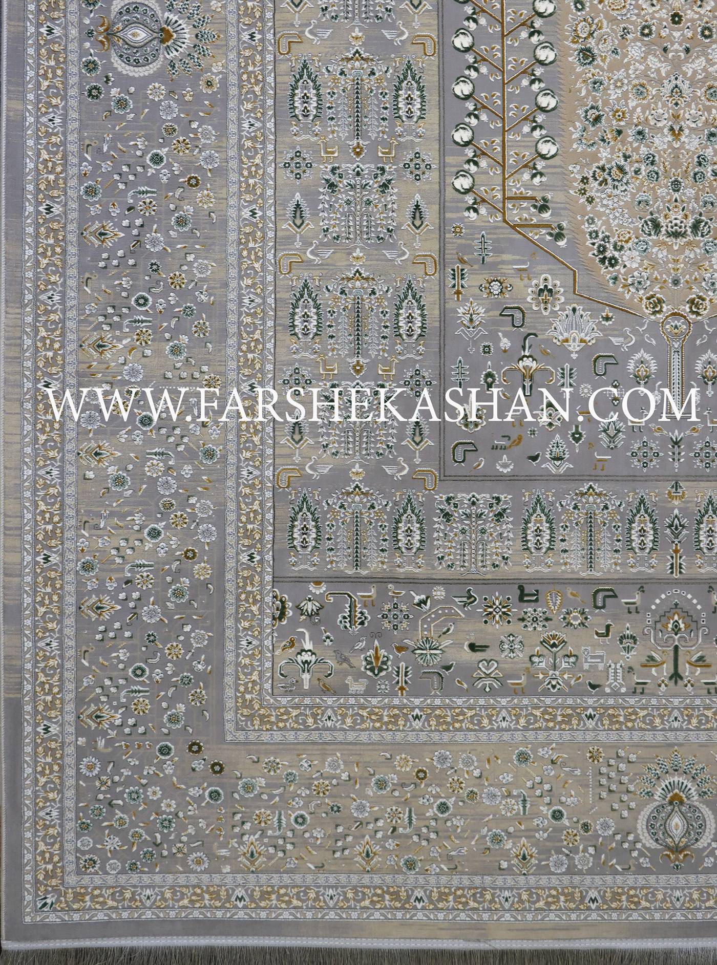 ساختار این فرش 1200 شانه با تراکم 3600 بر پایه هندسه دقیق و تقارن چهاربخشی است. قابهای پیرامونی با چینش آینه ای، ریتمی هماهنگ ایجاد کرده و نگاه را به سمت مرکز هدایت میکنند. طرح مرکزی ترکیبی از «درخت زندگی» و بته کشیده است که با گلهای گرد و برگهای بادامی تراکم پیدا میکند و حس قد کشیدن در فضا را القا میکند. استفاده از موتیفهای ختایی و شاه عباسیهای ریزاندام با ساقه های نازک، ظرافت خاصی به طراحی بخشیده است. پالت رنگی شامل سیلور خنثی به عنوان پایه، در کنار عاجی، نخودی طلایی، سبز یشمی و طوسی دودی است. این ترکیب رنگی باعث میشود نقوش هم از نزدیک خوانا باشند و هم از دور جلوهای یکدست داشته باشند؛ ویژگیای که بهویژه برای دکوراسیون مدرن و مینیمال بسیار ارزشمند است.