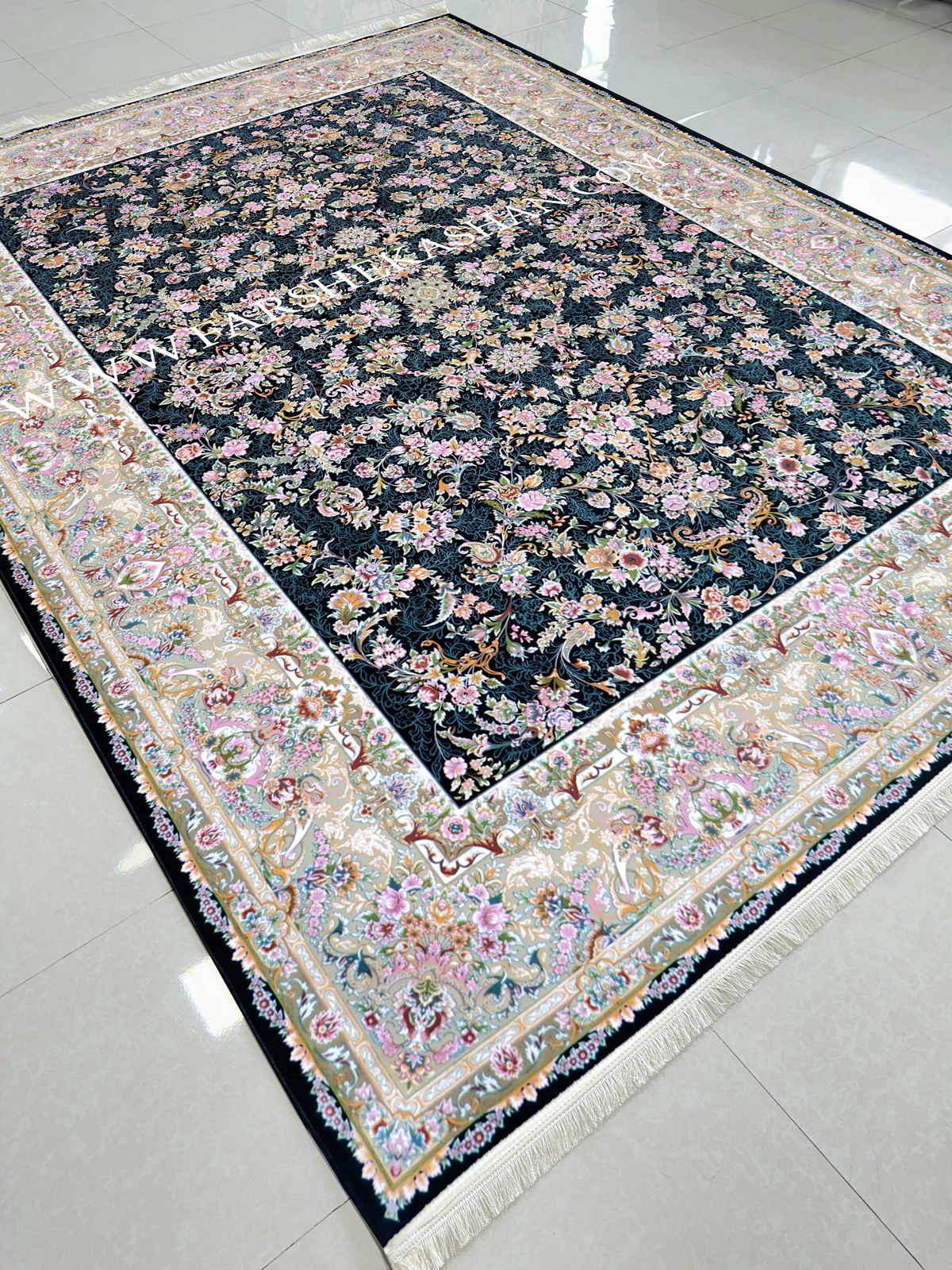 نسخه سرمه ای طرح آریا جلوهای کاملاً متفاوت ارائه میدهد. در این رنگ بندی، پس زمینه تیرهی سرمه ای، بستری عمیق و چشم نواز برای نمایش رنگهای روشن گلها و شاخهها ایجاد کرده است. در این حالت، تضاد رنگی میان زمینه و نقوش بیشتر میشود و گلها حالتی برجسته تر و زنده تر به خود میگیرند. سرمه ای همیشه رنگی فاخر و کلاسیک در فرش ایرانی به شمار میآید و در این طرح، هالهای از شکوه سنتی را بر فرش حاکم میکند. حاشیهها نیز در رنگ سرمهای جلوهای باشکوه تر دارند و نقوش ظریف درخشش بیشتری پیدا میکنند. در کل، این نسخه برای فضاهایی که نیازمند عمق و جلوه رسمی تر هستند، انتخابی ممتاز محسوب میشود.