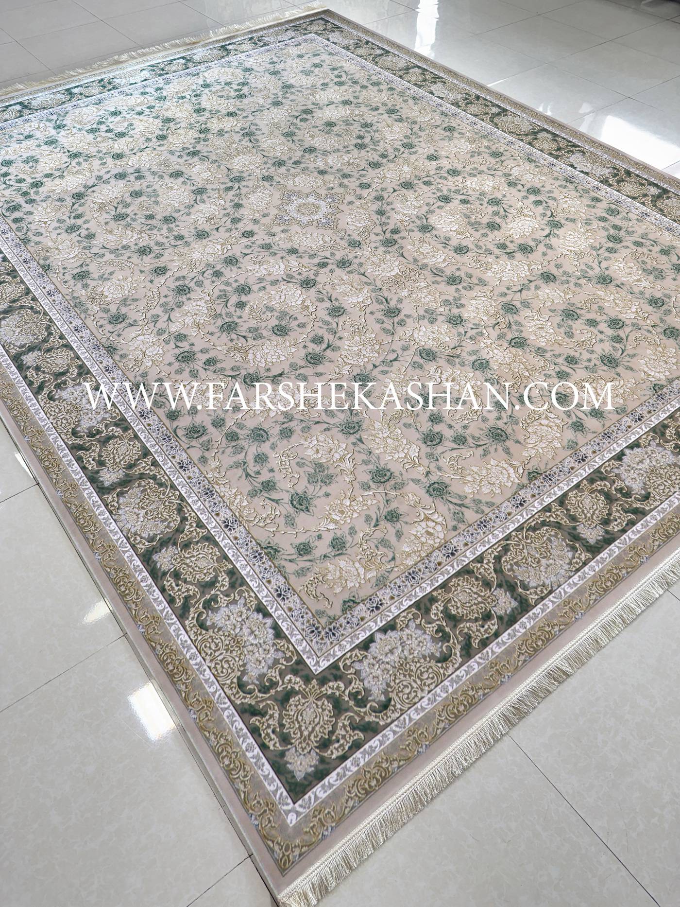 فرش طرح رزیتا ۲۰۱ با زمینه صدفی یکی از نمونه های ظریف و اصیل در دسته فرشهای کلاسیک گلریز کاشان است که با نگاهی مدرن بازطراحی شده است. با اینکه در نگاه اول خبری از ترنج مرکزی یا قاب بندیهای سنگین فرشهای سنتی نیست، اما آرایش منظم گلهای رز و اسلیمیهای طلایی، ساختار بصری فرش را به صورت دورانی و قرینه هدایت میکند و چشم را از هر نقطه به سمت مرکز می کشاند. استفاده از رنگ سبز یشمی در شاخهها و برگها روی زمینه صدفی روشن، جلوهای ملایم و چشم نواز ایجاد کرده که نه بیش از حد شلوغ است و نه ساده و بی روح. حاشیه سبز با قاب بندی کرم و طلایی در کنار لبههای فرش، انسجام طرح را کامل کرده و سبب شده که این مدل هم برای سلیقههای اصیل پسند جذاب باشد و هم برای کسانی که دنبال یک فرش شیک، روشن و متفاوت هستند. ترکیب صدفی، سبز و طلایی دقیقاً همان هارمونی ای است که در سالهای اخیر در طراحی داخلی لوکس محبوب شده و فرش رزیتا ۲۰۱ را به یکی از گزینه های پرفروش در دسته فرشهای گلریز کاشان تبدیل کرده است.