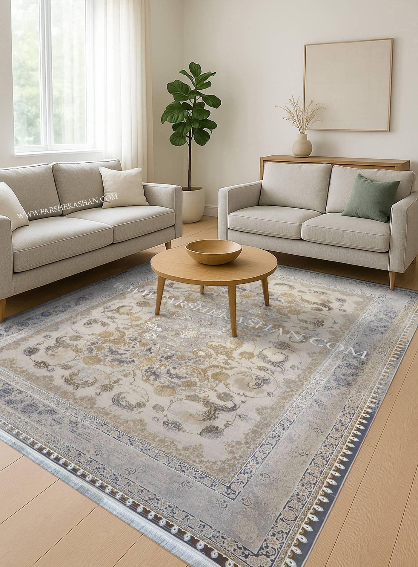 تحلیل کاربرد طرح و رنگ در دکوراسیون رنگ زمینه صدفی از جمله رنگهای خنثیِ لوکس است که بر خلاف کرم ساده، عمق نوری بیشتری دارد و در کنار مبلمانهای روشن، حس وسعت و پاکیزگی فضا را دوچندان می کند. ترکیب طلاییهای پراکنده و طوسی، نقرهای در نقشه درخشش باعث می شود که این فرش هم با مبلمان رنگ چوب طبیعی، بژ و طلایی ست شود و هم با مبلمان طوسی، نقره ای یا حتی بنفش ملایم هماهنگی چشم گیری پیدا کند. با توجه به سبک نیمه کلاسیک آن، میتوان گفت این فرش بهترین گزینه برای پذیراییهای سبک لاکچری مدرن، دکوراسیونهای نئوکلاسیک، فضاهای مینیمال با رنگهای روشن و حتی اتاق خوابهای بزرگ است که می خواهند با یک فرش روشن اما دارای طرح شاخص، حالت گرما و صمیمیت را حفظ کنند. استفاده از این فرش در فضاهایی با نور طبیعی یا نور سقفی سفید، باعث میشود بافت طلاگون طرح برجسته تر دیده شود، در حالی که زیر نور آفتابی یا هالوژنی، تونالیته یاسی، دودی آن غالب میشود و فضا را رمانتیک تر میکند. اگر در دکور خود از عناصر فلزی طلایی، نقرهای یا استیل استفاده کردهاید (مثل میز جلو مبلی، لوستر یا آینه دکوراتیو)، این فرش به طور هوشمندانه آنها را به هم پیوند میدهد و هارمونی کلی فضا را کامل میکند.
