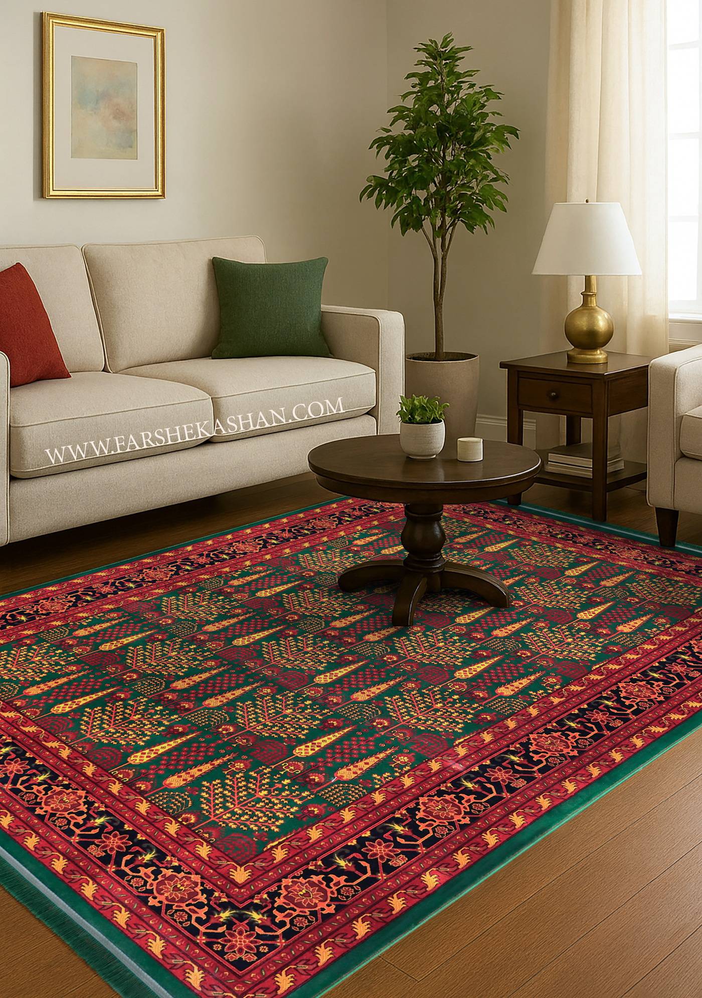 این فرش با مبلمان کرم، قهوهای، سبز تیره و طلایی بهخوبی ست میشود و برای فضاهای کلاسیک و مدرن مناسب است.