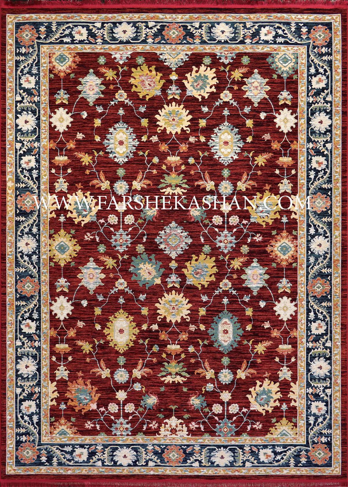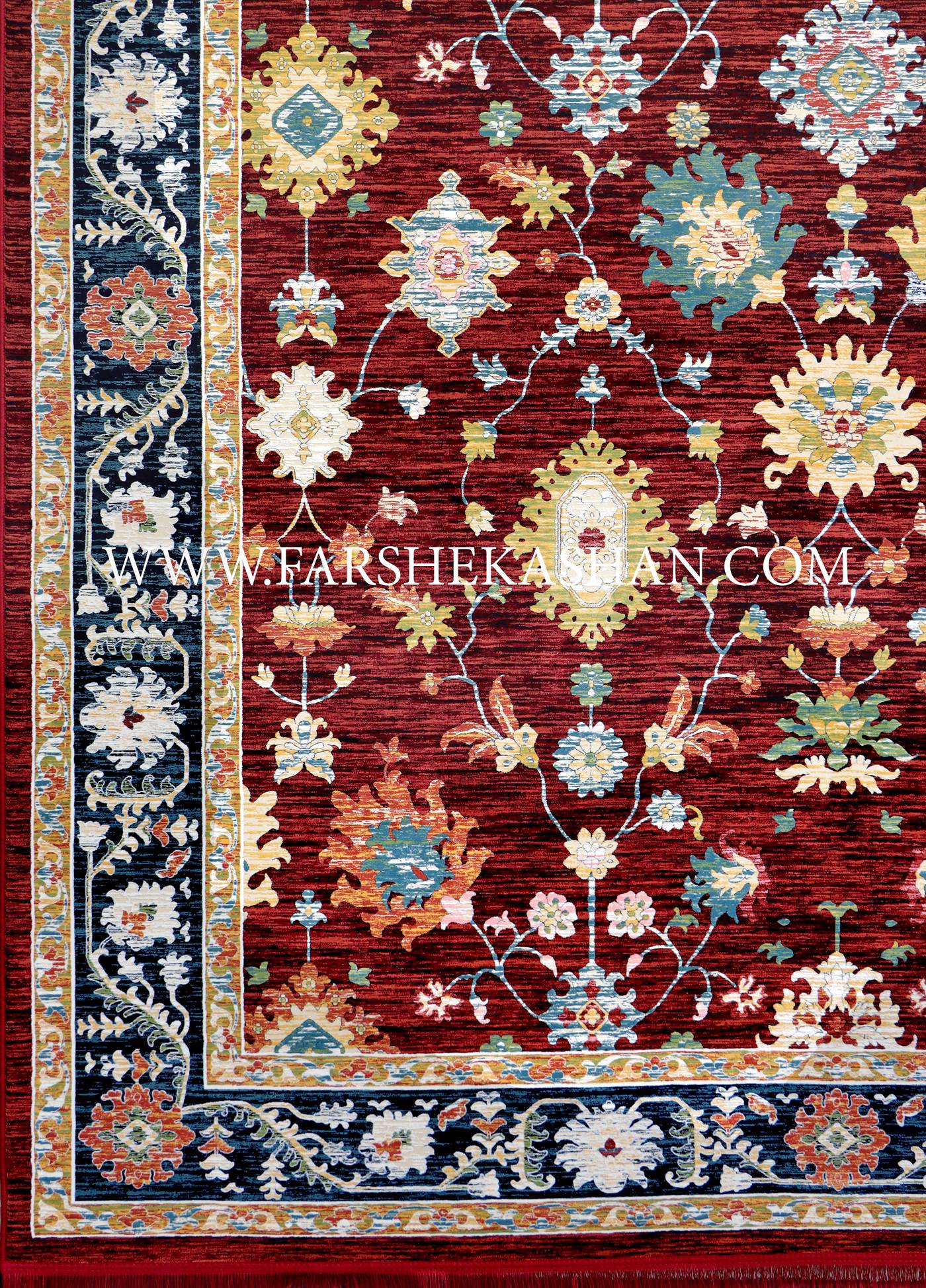 فرش کاشان طرح سلطانآباد از مجموعه نقوش کلاسیک الهام گرفته از قالیهای کهن ایرانی است که با بیانی امروزی بازآفرینی شدهاند. زمینهی لاکی عمیق و درخشان آن، بستری مناسب برای نمایش موتیفهای گلدار و پیچک های ظریف فراهم کرده است. نقوش اسلیمی، ختایی و گل های شاه عباسی با نظم هندسی چشم نواز در سراسر سطح فرش پراکنده اند و حاشیههای پهن سرمه ای و کرم، جلوه ای با شکوه و اصیل به ترکیب بندی کلی بخشیده اند. این طرح یادآور فرشهای سلطنتی اواخر دوره قاجار است که در بافت جدید فرش کاشان با وضوح رنگی بالا و تفکیک دقیق جزئیات بازسازی شدهاند. توازن بین رنگ، طرح و فضای منفی در این نقشه موجب شده فرش سلطان آباد در عین شکوه، خوانایی بصری و آرامش چشم را نیز حفظ کند.