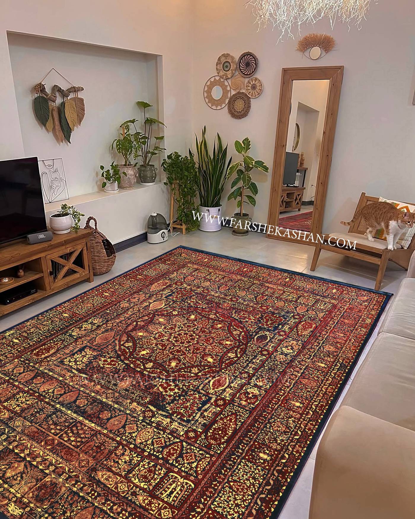 فرش کاشان طرح ۱۱۱۵ با ترکیب رنگهای روناسی، لاکی، مشکی و طلایی، جلوه ای فاخر و گرم به فضای منزل می بخشد. این فرش به ویژه در دکوراسیونهایی با مبلمان چوبی روشن، دیوارهای سفید یا کرم، و نور طبیعی عملکردی چشمگیر دارد؛ زیرا تضاد رنگی ملایمی میان کف و دیوار ایجاد کرده و فضا را عمیق تر نشان میدهد. حضور قابهای هندسی و ریزنقشهای پرجزئیات باعث میشود در فضاهای خلوت یا مدرن، نقش فرش به عنوان عنصر تزئینی اصلی جلوه کند. همچنین برای سالنهای پذیرایی کلاسیک، خانههای ویلایی و حتی اتاق نشیمنهای امروزی انتخابی ایده آل است. ترکیب رنگ روناسی در این طرح گرمای بصری بالایی دارد و باعث ایجاد حس صمیمیت در محیط میشود. اگر نورپردازی با طیف زرد ملایم یا نور طبیعی همراه شود، درخشش نخها جلوهای خاص و لوکس به دکوراسیون خواهد داد.