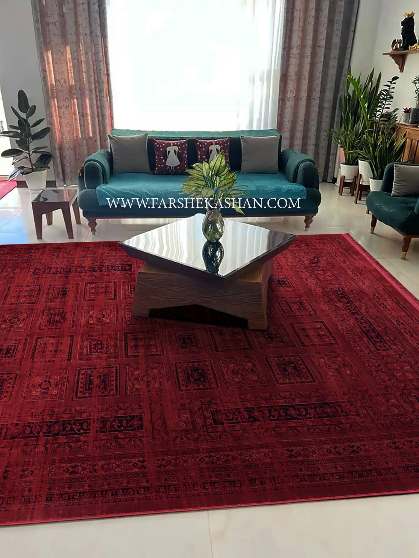 فرش کاشان طرح میرانا در سبک کلاسیک، عشایری قرار میگیرد؛ سبکی که ریشه در نقشه های ترکمن و بلوچ دارد اما با بازطراحی منظم تر و متقارن تر ارائه شده است. هویت اصلی این نقشه بر مبنای تکرار ستون بندی مربعی شکل است؛ مربعهایی که هرکدام درون خود یک موتیف مستقل دارند و در عین حال با کل ساختار هماهنگ اند. در این طرح، هر باکس دارای نقش مایه های هندسی مثل گلهای چهاربری، خطوط شکسته، موتیفهای سوزنی و تزیینات نقطه ای است که حال وهوای اصیل فرشهای شرقی را زنده نگه می دارد. حاشیهها کاملاً چند لایه طراحی شدهاند؛ قابهای تودرتو همراه با خط حاشیههای باریک، فضا را عمیق تر جلوه می دهند و به طرح نظم بصری قوی می بخشند. رنگ لاکی غنی، پس زمینه را به سطحی با ثبات تبدیل کرده و تضاد ملایمی با نقشهای تیره تر ایجاد می کند. نتیجه این ترکیب، فرشی ست با جلوه ای قدرتمند، رسمی و کاملاً چشم گیر. میرانا از آن نقشههایی ست که شخصیت فضا را بالا میبرد و به دلیل هندسه دقیقش، هم در دکور کلاسیک و هم در فضاهای مدرن با خطوط ساده، به خوبی خود را نشان می دهد. بافت ۷۰۰ شانه نیز باعث شده نقوش هندسی با وضوح و خط کشی دقیق دیده شوند و روح طرح بهتر نمایان شود.