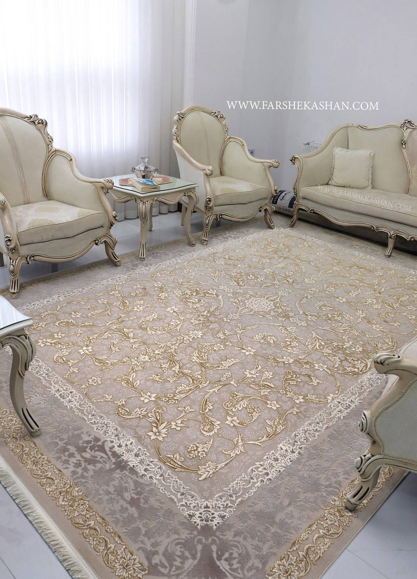 فرش طرح 3065 را می توان نمونه ای شاخص از سبک کلاسیک، لاکچری دانست که بر پایه ترکیب اسلیمیهای منظم، شاخه های کشیده و گلهای ظریف طراحی شده است. انسجام نقوش در قابهای چندلایه، نظم بصری محسوسی ایجاد می کند و اجازه می دهد طرح بدون شلوغی اضافی، جلوهای باشکوه و کاملاً متعادل داشته باشد. تضاد ملایم میان زمینه طوسی، نقرهای و نقش مایههای کرمی، طلایی، عمق طرح را افزایش داده و باعث شده جزئیات گلها و برگ ها واضح و برجسته دیده شوند. حاشیه های بیرونی با ریزنقشهای ظریف، ساختار اصلی را کامل کرده و نگاه را به سمت مرکز هدایت می کنند. ترکیب این عناصر، فرش 3065 را به مدلی تبدیل کرده که هم ریشه در زیبایی شناسی اصیل فرش کاشان دارد و هم از خطوط و اجرای مدرن بهره میبرد. به همین دلیل، این طرح از نظر جلوه بصری، ظرافت و هارمونی رنگ یکی از متمایزترین گزینه ها در دسته فرشهای روشن و فاخر محسوب میشود.