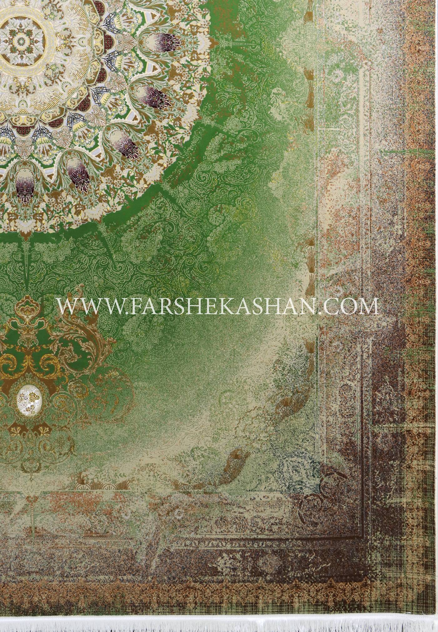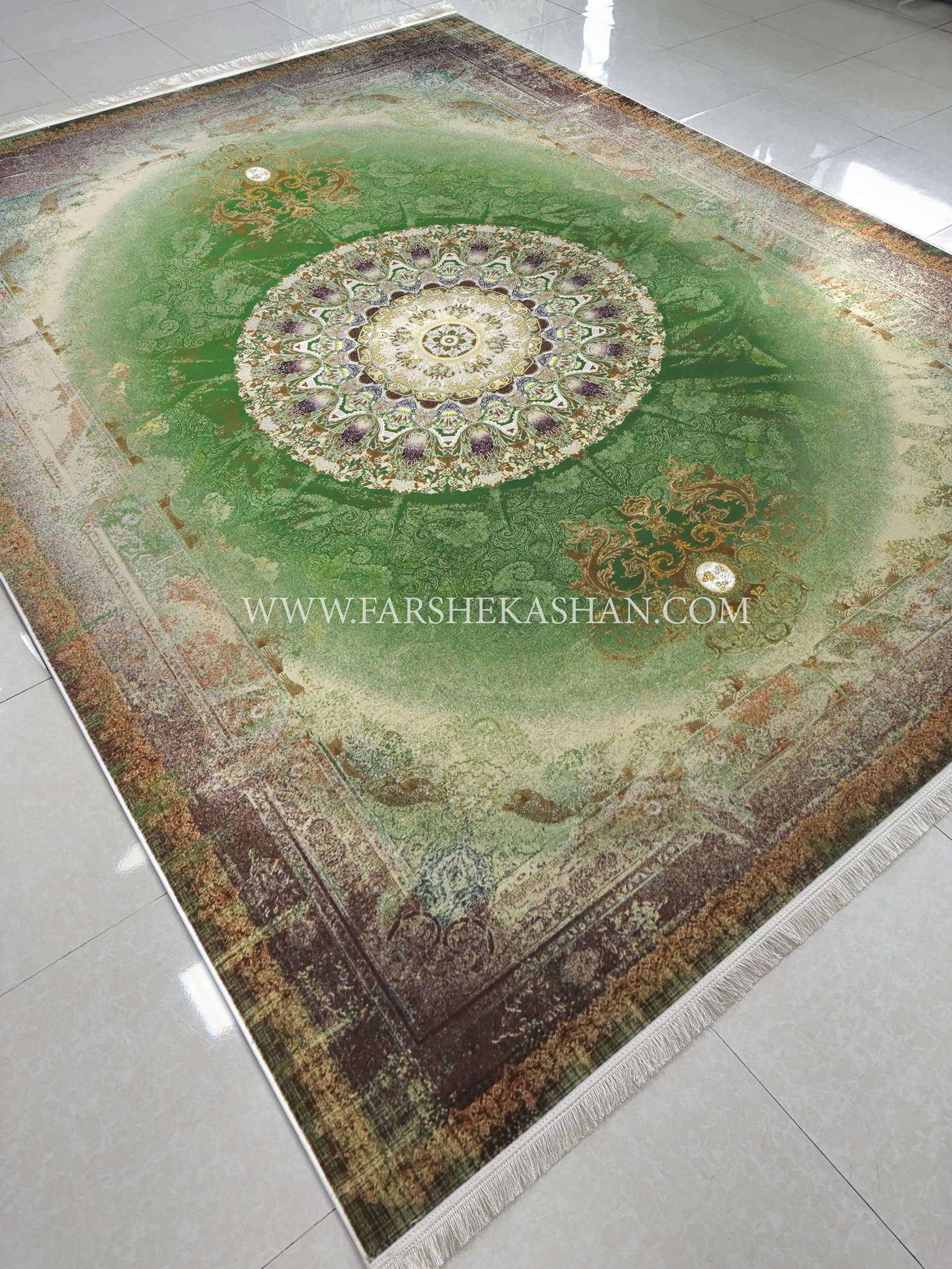 در بخش مشخصات، فرش برمودا با بافت 1500 شانه و تراکم 4500 جزو گروههای بسیار ریزبافت قرار می گیرد؛ یعنی جزئیات ریز نقشه، ترنج چند لایه، زنجیرههای اسلیمی و سایه پردازیهای محوشده بدون شکستگی دیده می شود. نخ استفادهشده در تولیدات این سطح، اکریلیک هیت ست شده با کیفیت بالاست که مقاومت، لطافت و پف برگشتی خوبی دارد و برای استفاده طولانی مدت کاملاً مناسب است. در فرشهای 1500 شانه، مهم ترین نکته یکنواختی سطح است و در برمودا این موضوع کاملاً رعایت شده؛ نه گره سوزی دارد، نه شکستگی سایه. ایستایی فرش روی زمین هم بالاست چون تراکم بالا باعث می شود سطح فرش سنگین تر و پایدارتر باشد. نسخه سبز نسبت به نسخه لاکی، کمی روشن تر دیده میشود و به دلیل همین روشنایی، بازی سایه پردازیهای طرح جلوه بیشتری پیدا می کند؛ اما رنگ لاکی، عمق بیشتری به هالههای اطراف ترنج می دهد و نقشه را رسمی تر نشان میدهد. هر دو رنگ از نظر کیفیت بافت و جنس یکسان اند و تفاوت صرفا در شخصیت بصری آنهاست.