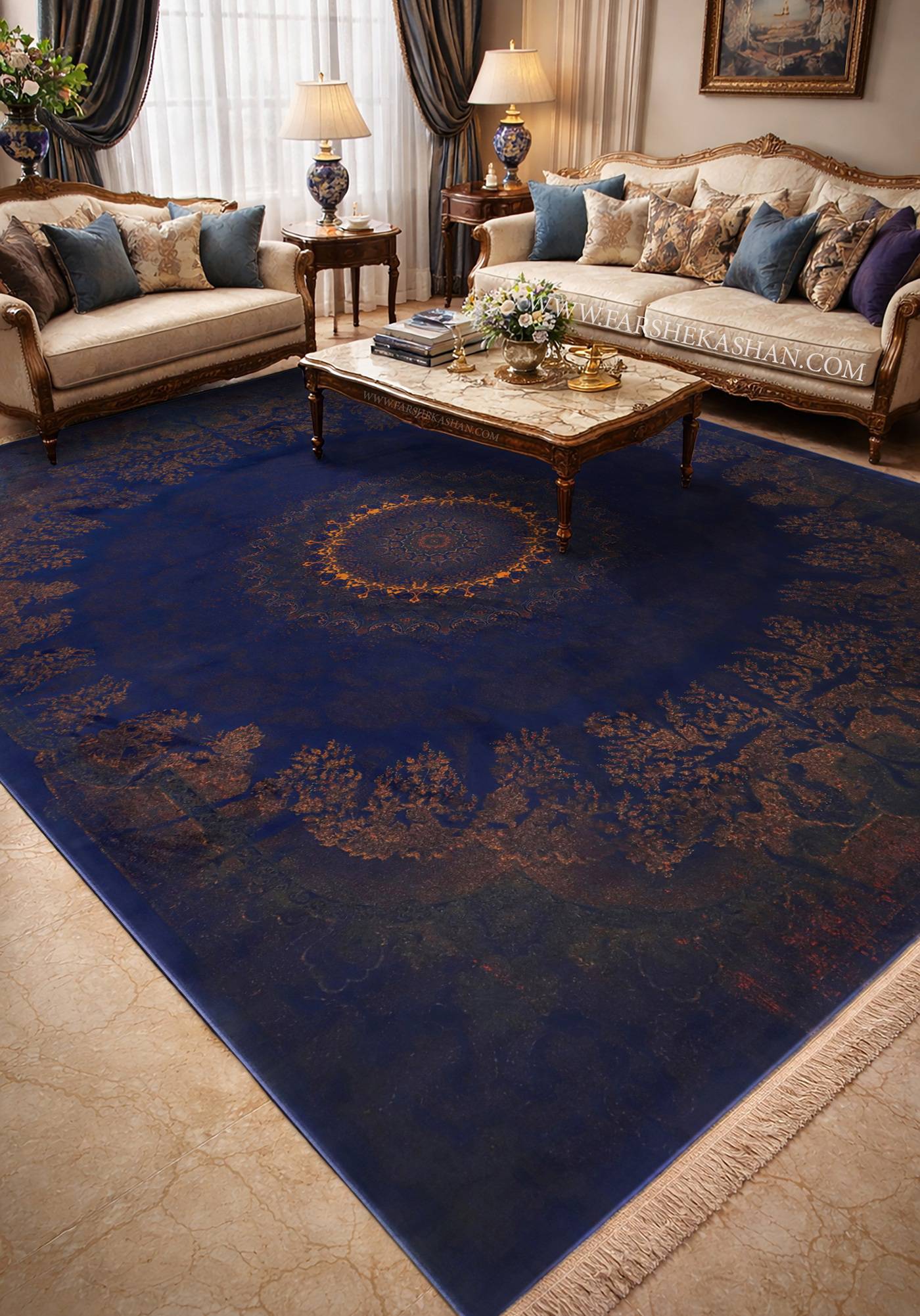 رنگ آبی اطلسی فرش اپرا با چه مبلمانی هماهنگ میشود؟