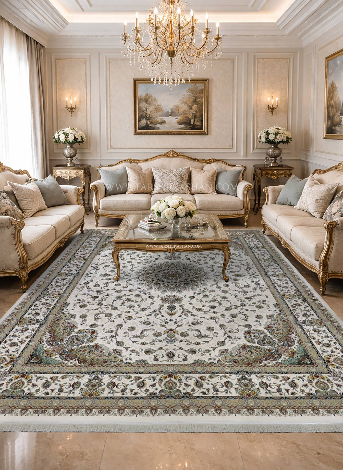 فرش کرم روشن کلاسیک ظهیر و کاربرد آن در دکوراسیون لوکس پذیرایی