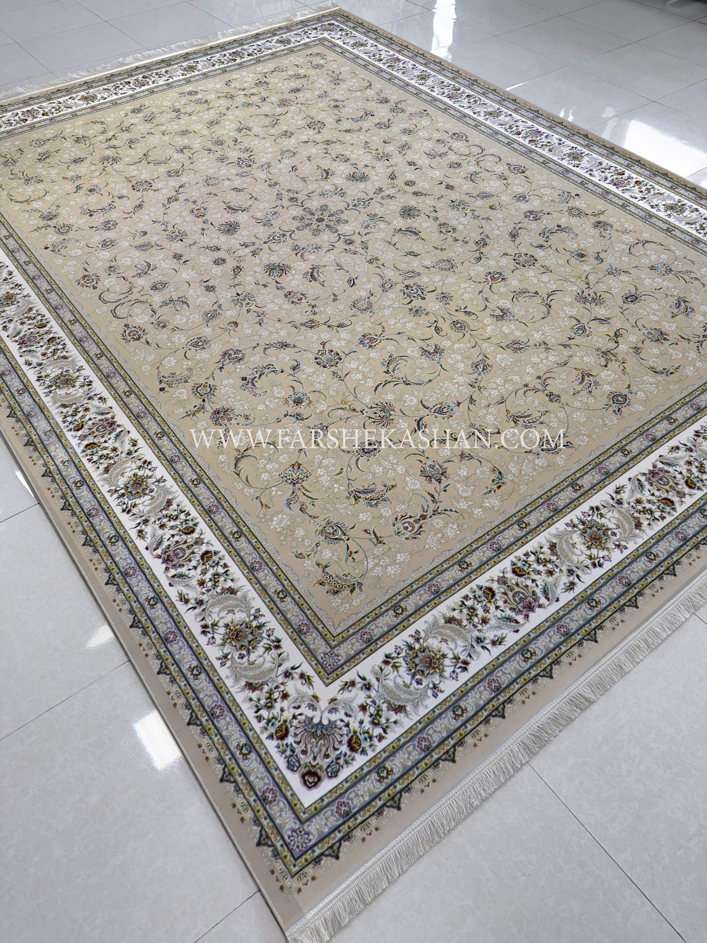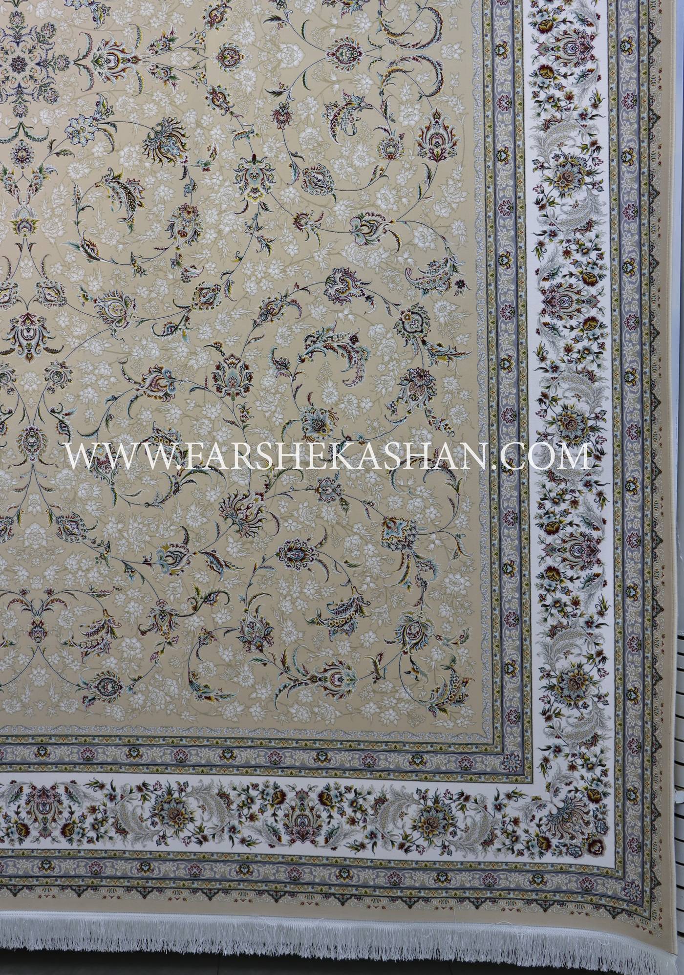 فرش نفس با شانه ۱۵۰۰ و تراکم ۴۵۰۰ دقیقا در محدوده ای قرار می گیرد که ظرافت نقشه معنا پیدا میکند، نه فقط عدد روی کاغذ. این تراکم بالا باعث شده ریزنقشها، مخصوصا گلهای ختایی و خطوط اسلیمی، کاملا تفکیک شده و بدون له شدگی دیده شوند؛ چیزی که در طرحهای آرام اگر نباشد، کل نقشه بی روح می شود. نخ خاب از الیاف ۱۰۰٪ اکریلیک هیت ست شده انتخاب شده که هم ایستایی مناسب دارد و هم پرزدهی اولیه اش به حداقل رسیده است. خواب فرش متعادل است؛ نه آن قدر کوتاه که خشکی بدهد و نه آن قدر بلند که نقشه را بخواباند. ثبات رنگ در این مدل اهمیت دوچندان دارد، چون طیفهای ملایم اگر کیفیت رنگرزی پایین باشد خیلی زود کدر می شوند. در نفس رنگها زنده اما کنترل شده اند و بعد از مدتی استفاده، به خاکستری مرده تبدیل نمی شوند. ریشه ها ظریف و هم راستا با شخصیت فرش انتخاب شدهاند و بهخوبی با بافت کلی هماهنگ اند. این مشخصات باعث می شود نفس فرشی صرفاً تزئینی نباشد و برای استفاده طولانی مدت در فضای اصلی خانه کاملا قابل اتکا باشد.
